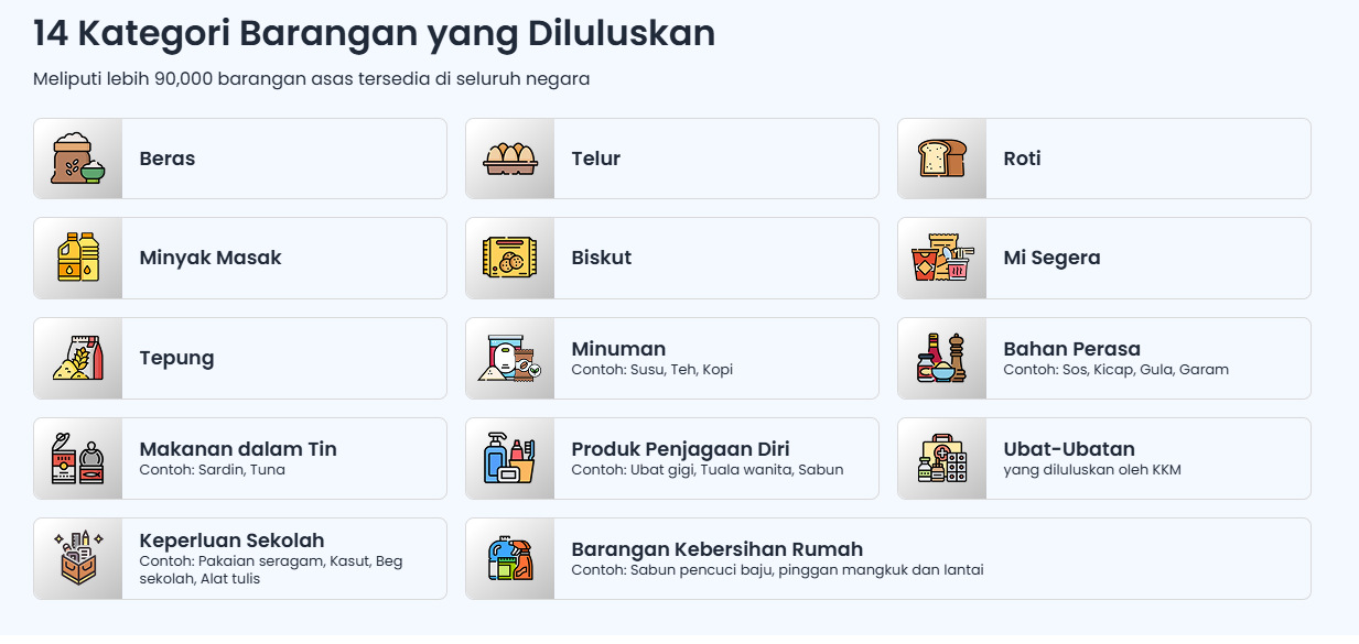 Barangan Yang Dibenarkan | 14 kategori barangan asas (beras, telur, mi segera, makanan tin, dan lebih banyak lagi) |